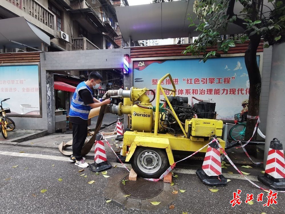 16时08分,雨势减弱,长江日报记者现场看到,位于老三栋住宅楼的门口都架起临时泵车,排水工人正在调控水闸、清理管网杂物,保障排水管网畅通。