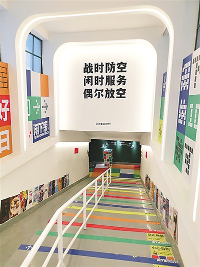 “战时防空,闲时服务,偶尔放空。”三行活泼的标语印在“闲下来”的入口处。这是个防空洞,仙霞新村街道在得到长宁区民防办许可后,让它有了新用途——亲子课堂、手工坊、艺术展、观影读书会,还有放映室、阅览室、自习室、闲人客厅,意想不到、新奇好玩的文化活动正在不同功能区进行着。