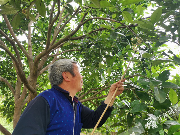 当天下午,村民魏生元正在自己的柚子林里给柚花授粉,他告诉华龙网-新重庆客户端记者,授粉的“原料”是酸柚花或红心柚花蕊。只见,他拿着如毛笔一样的工具在玻璃罐里沾取花粉,再借助长竿,为树梢的柚子花“点粉”,犹如“蜻蜓点水”一样轻轻将花粉擦到柚子花朵的柱头上。