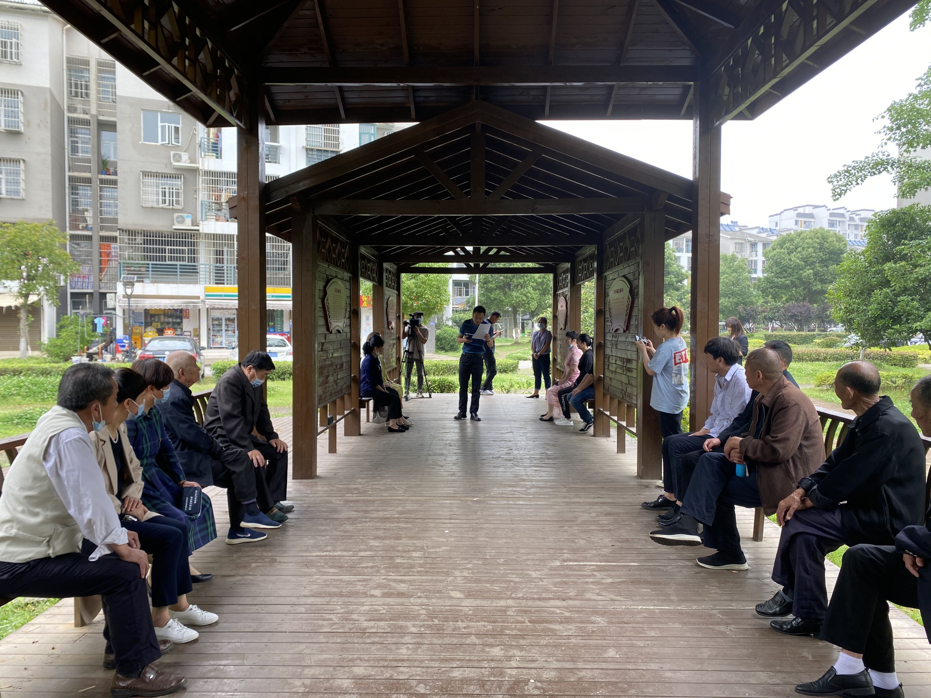 新苑社区廉政长廊内,宣讲队成员与党员群众围坐讲党史。 长江日报记者蔡欣星 摄