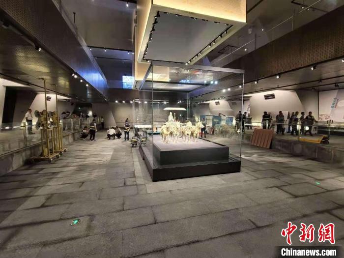 中新网西安5月12日电 (记者 阿琳娜)12日,“青铜之冠”秦陵彩绘铜车马二号车启程运往新落成的铜车马博物馆,其“新车位”距离铜车马的出土地只有约240米。