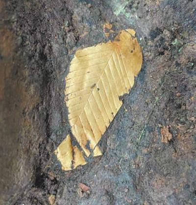 4月16日,考古队已经完成了对8号坑灰烬层的整体堆积形态揭露,发现了高密度青铜器碎片、金箔、玉石器等遗物。在灰烬层表面的绝大部分青铜器都在填埋前被有意识地打碎,破碎度很高,且不少经过了火烧。神树的枝杈、青铜树叶、黄金树叶等精美文物陆续出土。黄金树叶是之前的器物坑未曾出土过的,大家不由得想象它原来的位置和功能。