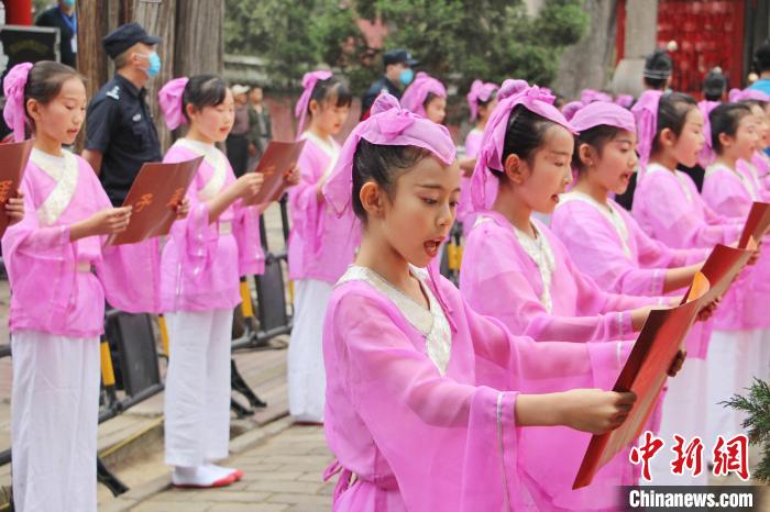 身着古代服饰的小学生诵读孟子名言。 赵晓 摄