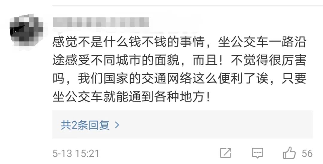 唐同学说,虽然比起高铁飞机来说,公交车确实没有那么方便。但通过坐公交车旅行能够感受到各地方言和人文的魅力,会很直观地体会到国家到底有多大,这种感觉很踏实。“各地风土人物,是那么丰富而不同!”