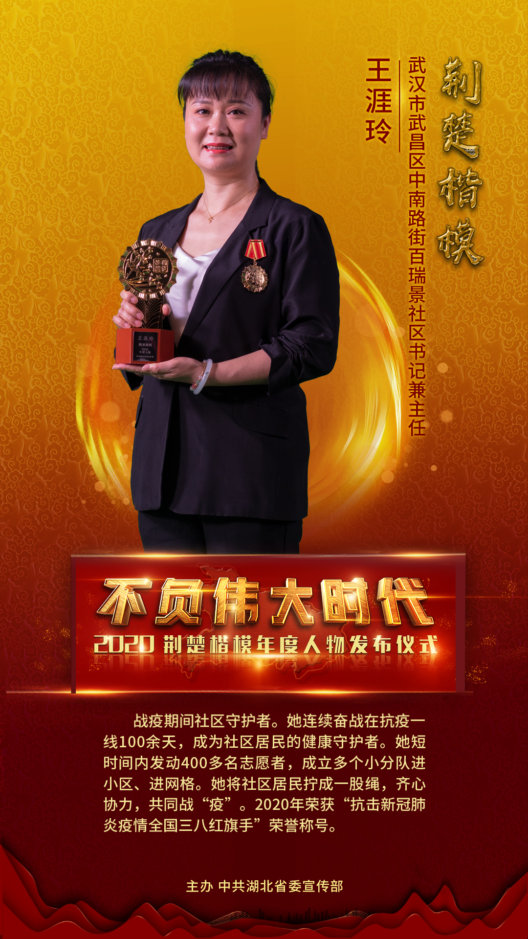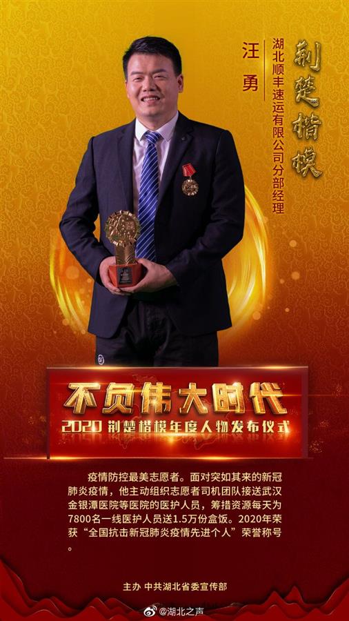 5月15日晚,由省委宣传部主办的不负伟大时代——2020“荆楚楷模”年度人物发布仪式在东湖宾馆国际会议中心举行。在2020年评选出的64位月度荆楚楷模的基础上,经过专家评审、群众投票,9位个人和集体光荣当选“2020荆楚楷模年度人物”。