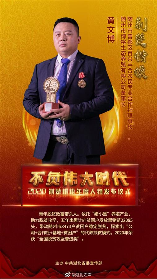 依托“猪小黑”养殖产业,助力脱贫攻坚,五年来累计向贫困户发放黑猪苗22085头,带动随州市8473户贫困户稳定脱贫,探索出“公司+合作社+基地+贫困户”的代养扶贫模式。2020年荣获“全国脱贫攻坚奋进奖”。