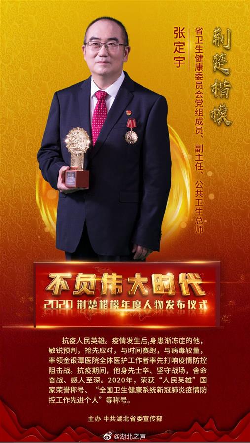 疫情发生后,身患渐冻症的他,敏锐预判,抢先应对,与时间赛跑,与病毒较量,率领金银潭医院全体医护工作者率先打响疫情防控阻击战。抗疫期间,他身先士卒、坚守战场,舍命奋战、感人至深。2020年,荣获“人民英雄”国家荣誉称号、“全国卫生健康系统新冠肺炎疫情防控工作先进个人”等称号。