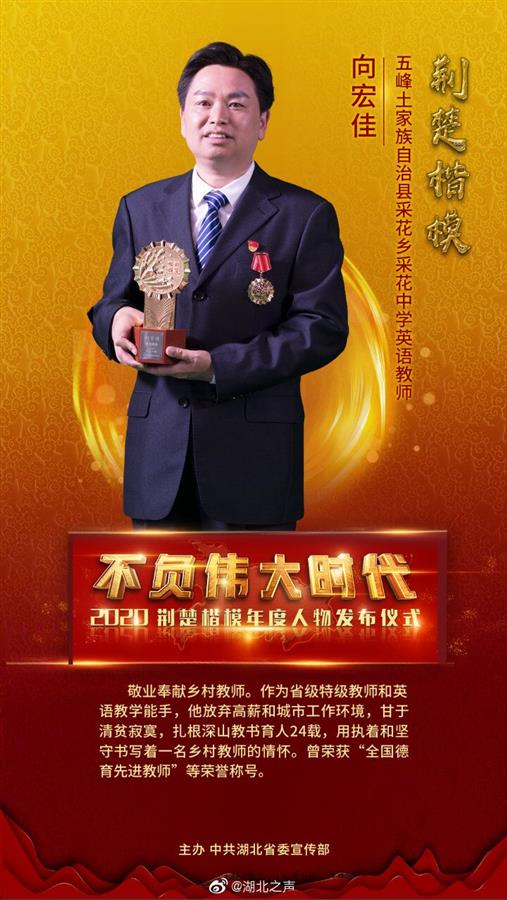 作为省级特级教师和英语教学能手,他放弃高薪和城市工作环境,甘于清贫寂寞,扎根深山教书育人24载,用执着和坚守书写着一名乡村教师的情怀。曾荣获“全国德育先进教师”等荣誉称号。