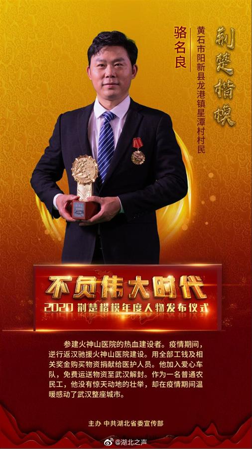 疫情期间,逆行返汉驰援火神山医院建设。用全部工钱及相关奖金购买物资捐献给医护人员。他加入爱心车队,免费运送物资至武汉解封。作为一名普通农民工,他没有惊天动地的壮举,却在疫情期间温暖感动了武汉整座城市
