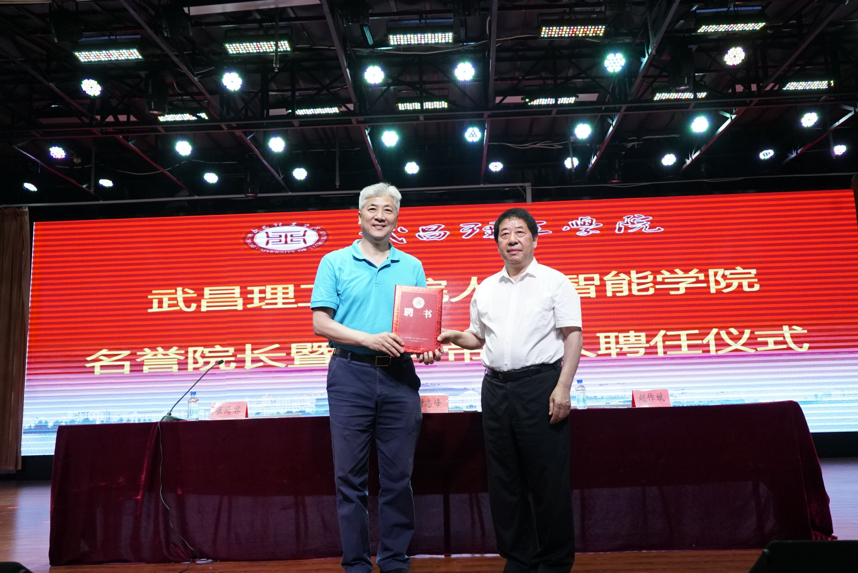 武昌理工学院校长赵作斌教授给谢志峰博士颁发聘书。通讯员供图