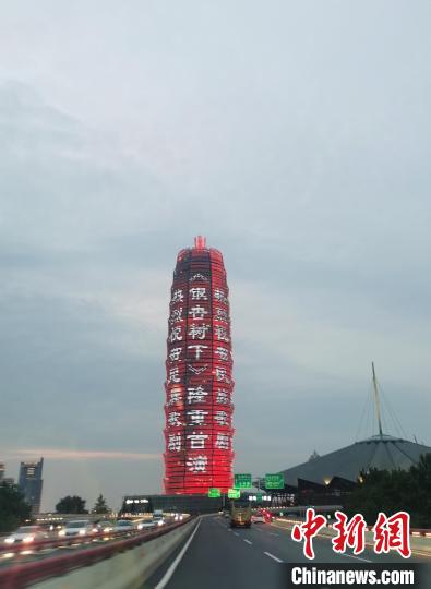 郑州地标“大玉米”播放的《银杏树下》展演信息。 刘鹏 摄
