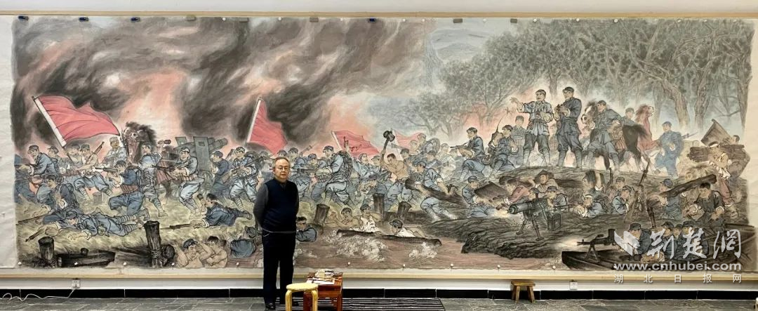 直播期间,李乃蔚向网友展示了近百幅作品。其中,一幅长达8米、宽2.8米的历史巨作——《刘邓大军千里跃进大别山》感情浓烈,让人身临其境。为重现具有时代特征的解放军英勇战斗的集体群像,李乃蔚查阅了大量关于解放战争的史料,设身处地地体味革命战争的情景,连续三个月往返于大江南北(汉口家中—武昌墨语堂美术馆画室),爬高下低,精心刻画。