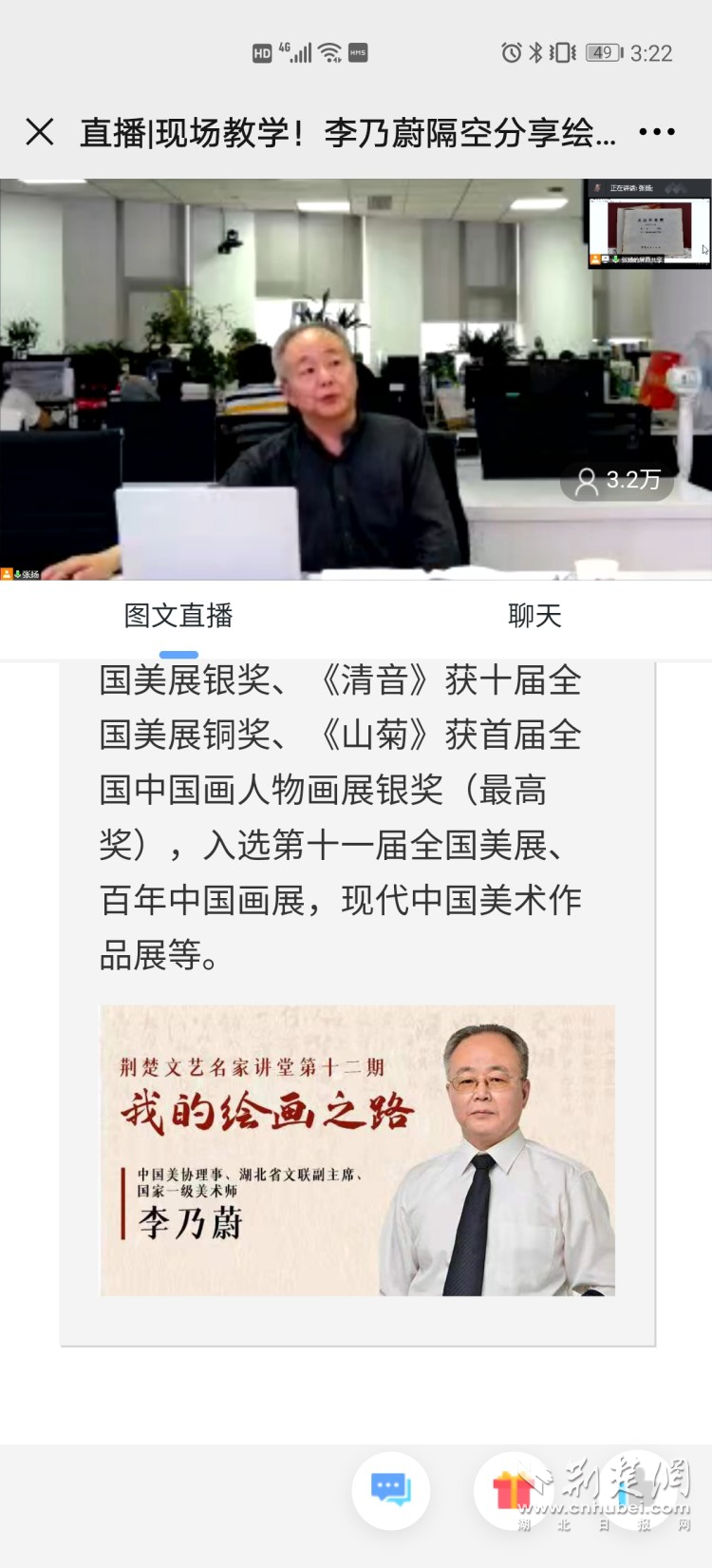 荆楚网(湖北日报网)讯(记者张扬 通讯员张静)一张白纸,需要多少笔墨,才能绘就入骨传神的画作?一位画家,需要怎样磨砺,方可迈进国家美术的殿堂?5月13日,中国工笔画知名画家李乃蔚做客“荆楚文艺名家讲堂”(第十二期),与9万余名网友分享他秉承传统、融合中西的绘画之路。