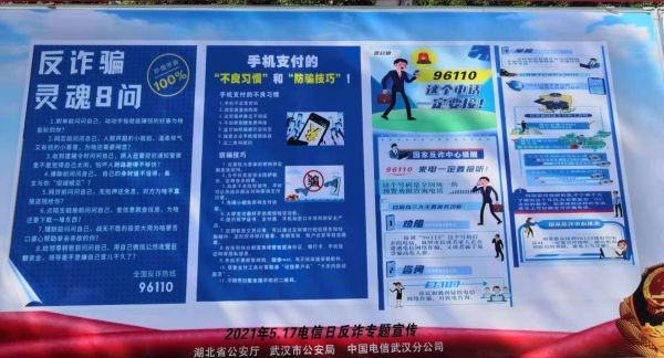 长江日报5月17日讯 5月17日是2021年世界电信和信息社会日,湖北省、武汉市公安局联合中国电信运营商举办“三电”保护和防通讯信息诈骗的线下宣传活动,除了向市民揭秘常见的典型通讯信息诈骗手法,告知市民“96110”这个电话一定要接,还有反诈骗灵魂8问,有用又有趣。