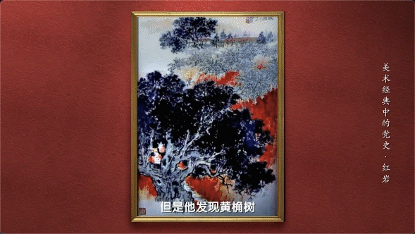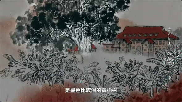 于是他开始做调整,把黄桷树比例缩小,把芭蕉用白描简单勾勒,采用大面积使用朱砂这种大红色的效果来表现红岩村所蕴含的革命精神,深化红色革命的主题。