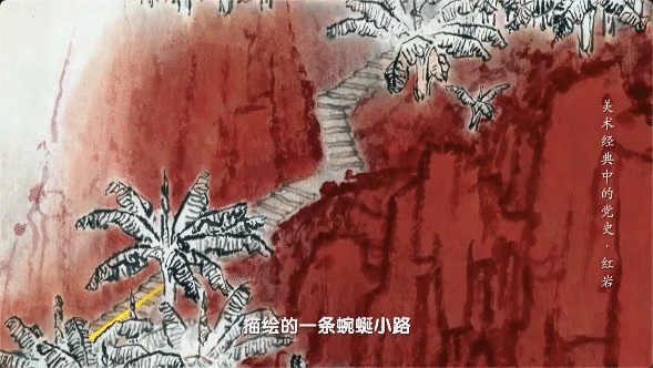 岩石中间用白描手法描绘了一条蜿蜒小路,象征着革命道路虽然曲折,但终究会获得胜利。