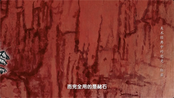在国画《红岩》中,大面积的红色岩石,由纵横相间、长短不一的线条构成。