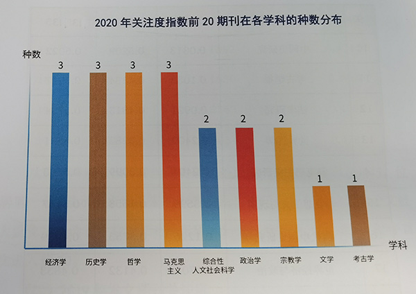 《报告》指出,对收录的学术期刊进行了学科划分,包括综合性人文社会科学、马克思主义、哲学等24个学科。对2020年的期刊关注度指数排序后发现,排名前20的期刊主要分布在经济学、综合性人文社会科学(包括自然综合和社科综合》、历史学等9个学科领域。