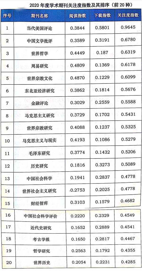 《报告》梳理了2020年度期刊关注度,《当代美国评论》《金融评论》等期刊位列前20。