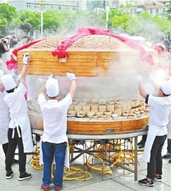 中国烹饪大师张在祥工作团队开启“神州第一笼”。