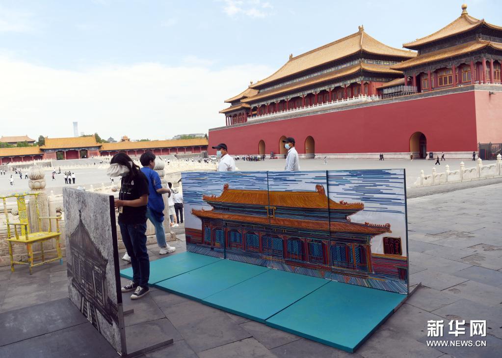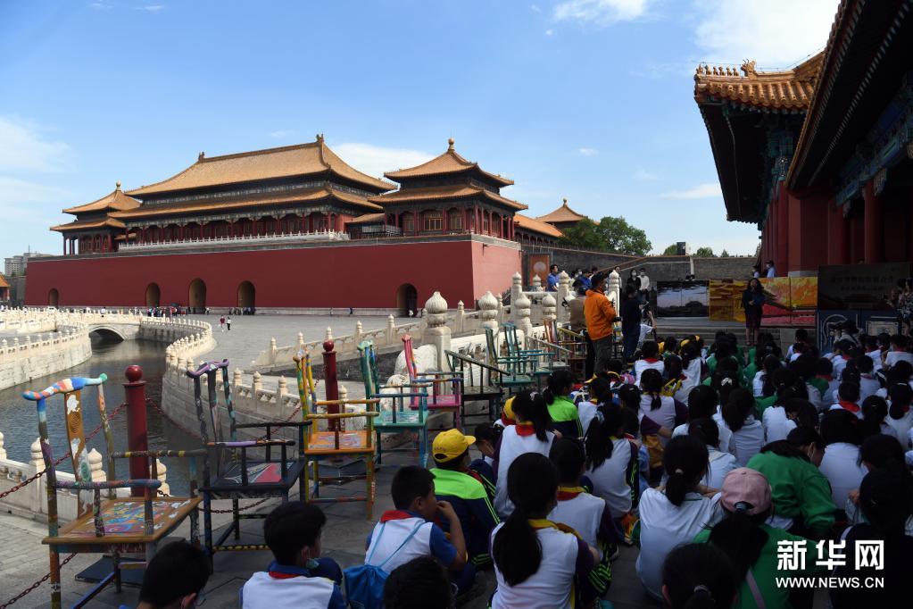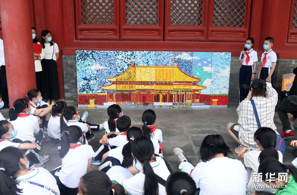 5月18日,北京西二旗小学学生在介绍用各种装饰材料拼贴出的故宫太和殿作品。当日是国际博物馆日,故宫博物院宣教部在太和门广场举行馆校合作教育成果展示,集中展示与各类学校综合实践课程和艺术创作合作成果。新华社记者 金良快 摄