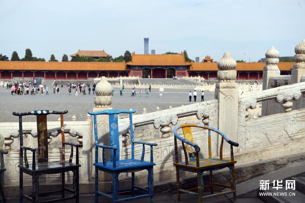 这是活动现场展出的彩绘木椅(5月18日摄)。该项目由故宫宣教部与北京市学生金帆书画院合作,学生在老师的指导下,对榫卯结构的木椅进行拆解、重组以及创作彩绘。新华社记者 金良快 摄