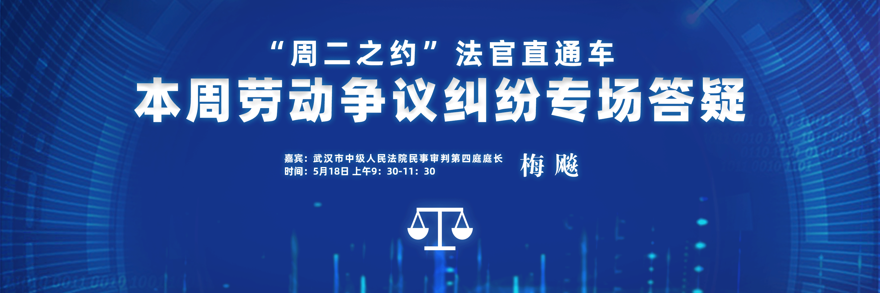 本周二至周五下午5时30分,梅飚庭长轮值“周二之约”法官直通车(点击下图二维码直达),线上为网友提供法律咨询服务。