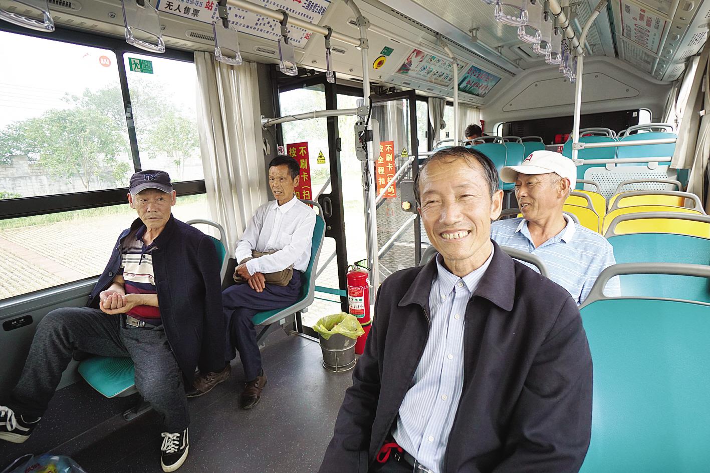 投币5元,挑着一筐竹笋,64岁的村民刘华珍上了公交车,坐在前面第二个座位。宽敞的车厢里还有七八位村民,全是头发花白的老人。
