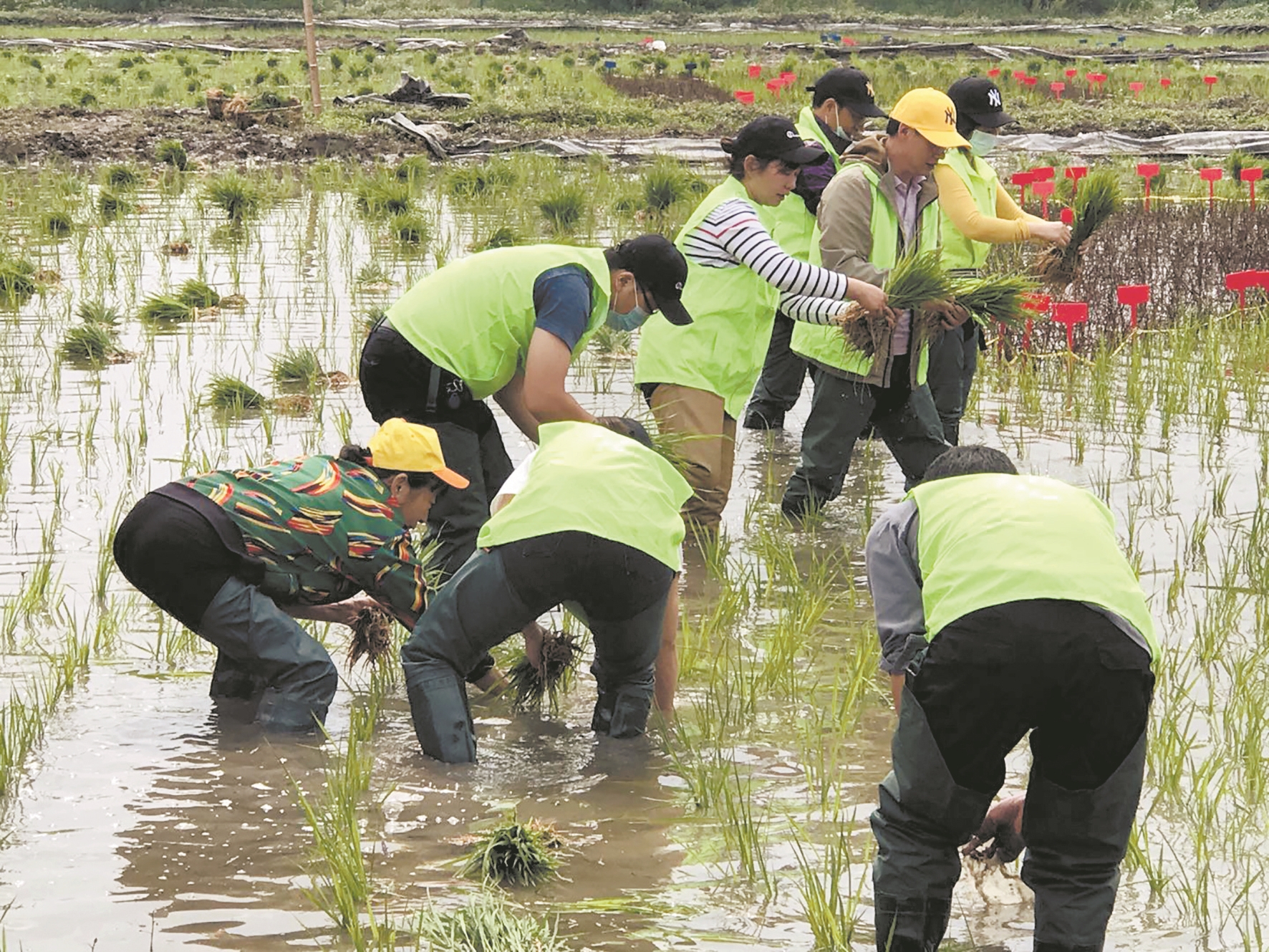 在稻田中,该校生科院师生和蔡甸区街道按设计好的图纸用竹签和红线做好标记,并根据标记分组进行种植,从空中俯瞰,40亩稻田仿佛巨型画板,他们则在画板上“作画”(如图)。