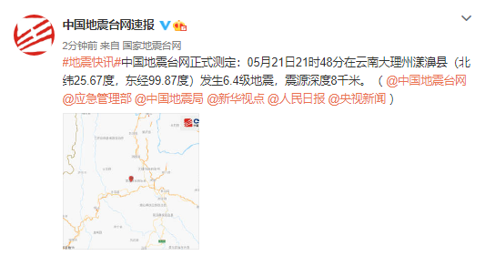 中国地震台网正式测定:05月21日21时48分在云南大理州漾濞县(北纬25.67度,东经99.87度)发生6.4级地震,震源深度8千米。