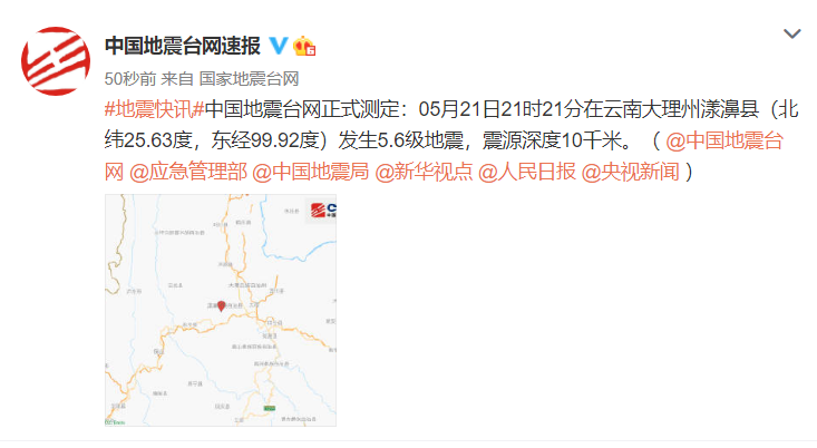 中国地震台网正式测定:05月21日21时21分在云南大理州漾濞县(北纬25.63度,东经99.92度)发生5.6级地震,震源深度10千米。