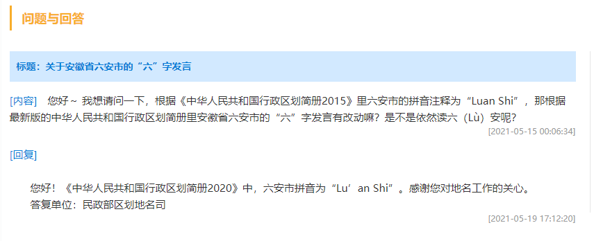 此前,有网友在民政部官网留言询问“六安”的读音问题,民政部区划地名司回复称,《中华人民共和国行政区划简册2020》中,六安市拼音为“Lu’an Shi”。人民网也就此问题尝试联系教育部语言文字信息管理司和国家语言文字工作委员会,但截止发稿时还未收到回复。