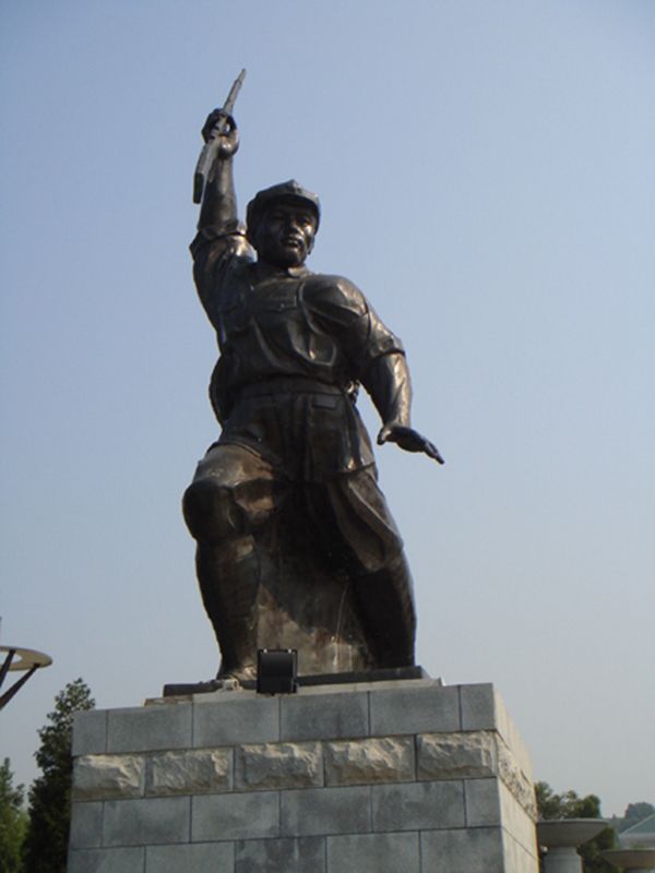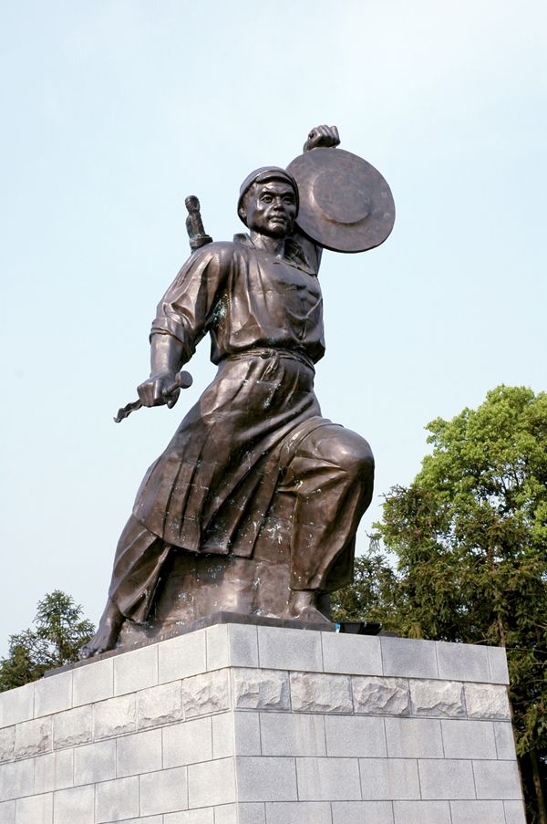 黄麻起义和鄂豫皖苏区纪念园中的两尊雕塑。上图塑:武装农民身背大刀,高举铜锣;下图塑:红军战士高擎钢枪,奋勇向前。