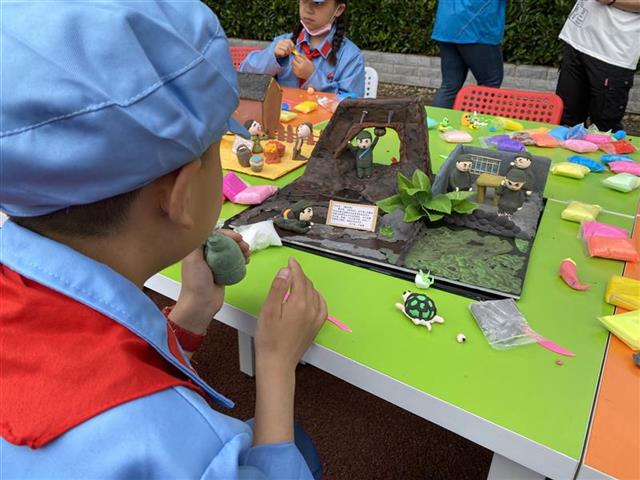 操场上,竹篾画、红色小报、书法、泥塑……丰富多彩的学生作品,是童心向党的真情流露。学生们的作品中,夏明翰的名字出现得最多。