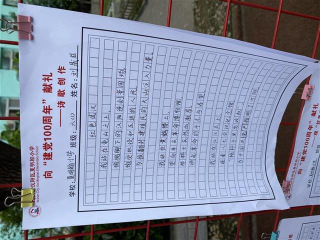 “我站在汉江关上,遥看八七会议纪念馆,枪杆子里出政权,为中国共产党指明了方向……”六年级学生刘晟喆在自己创作的献礼建党百年诗中写道。