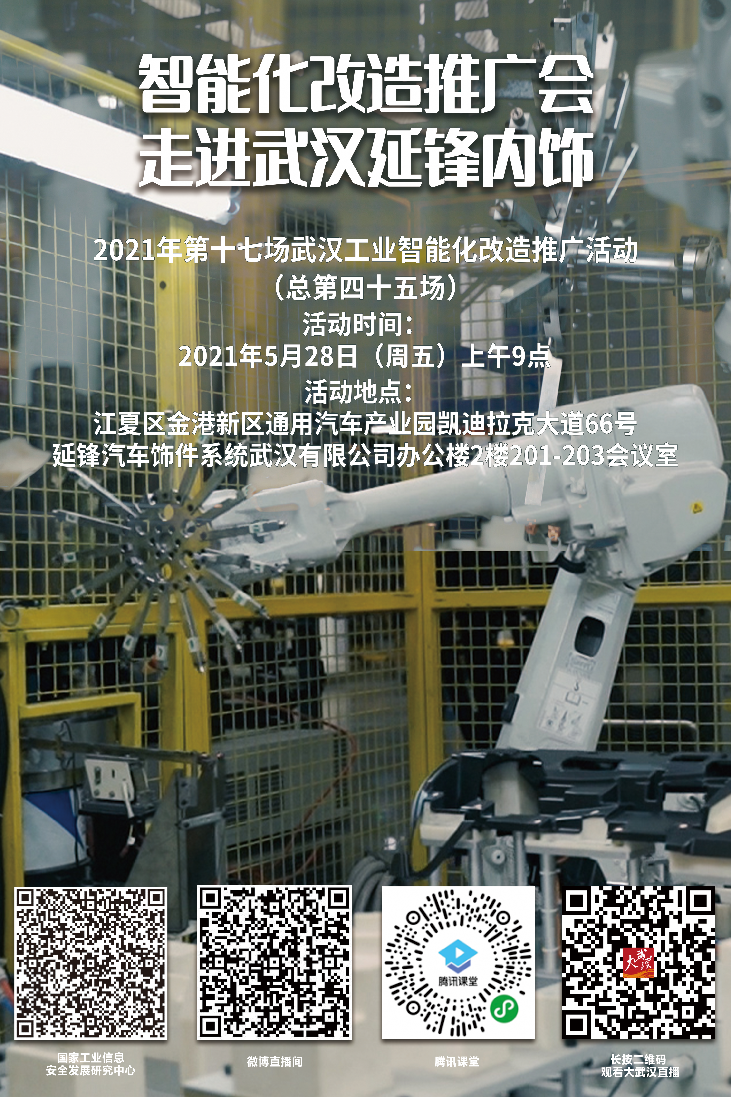 本场推广会依旧以线上线下同步的方式举行,武汉延锋内饰的相关负责人将分享智能化改造的经验,华工科技、武汉发那科、格创东智等6家市级工业智能化改造咨询诊断平台将到场并做智能化改造点评。关注武汉工业智能化改造的广大读者可通过大武汉直播平台、腾讯课堂、微博直播间等同步收看。