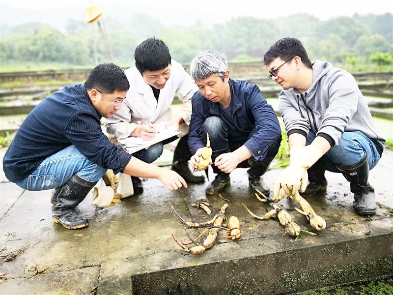 学科带头人柯卫东研究员(右二)带领团队成员在田间开展莲藕选种。