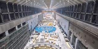 总台央视记者 宋菀:在白鹤滩水电站有两个世界最大规模的地下厂房,它们位于大坝两侧的山体深处,这里一共安装了16台百万千瓦水轮发电机组。我身旁的这个大家伙就是发电机组的核心部件转子,电能主要用过它转换出来。当16台机组全部投产发电时,一天的发电量可满足50万人一年的生活用电。