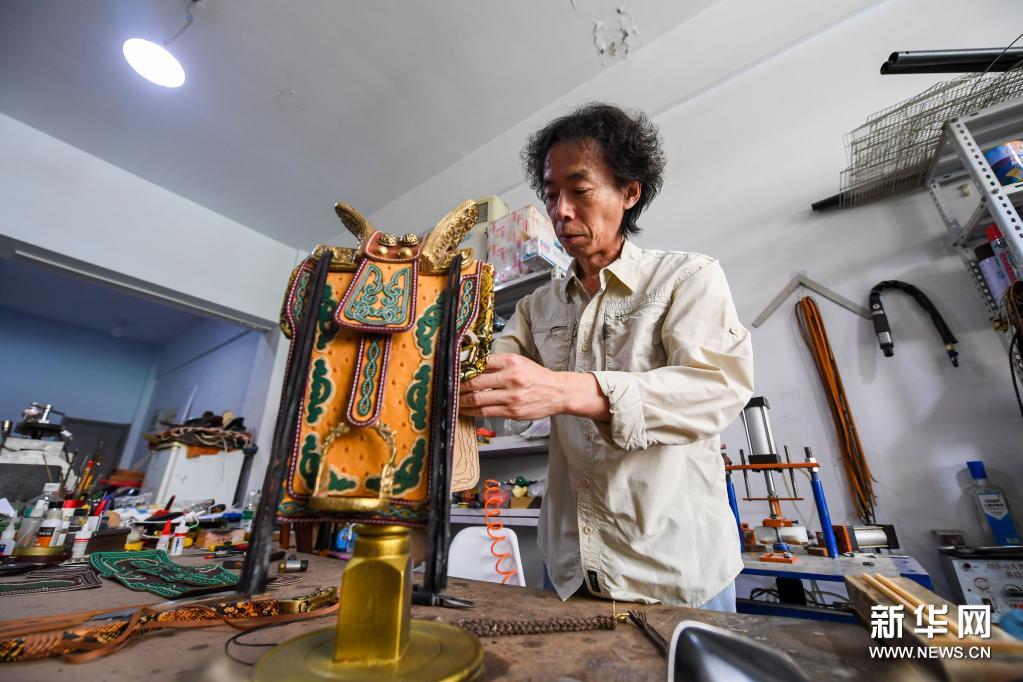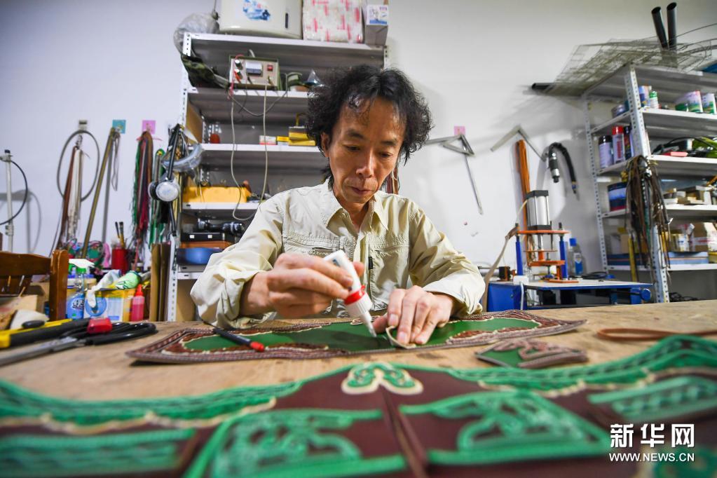 5月26日,锡林虎在工作室内制作马鞍造型的手工艺品。新华社记者 彭源 摄