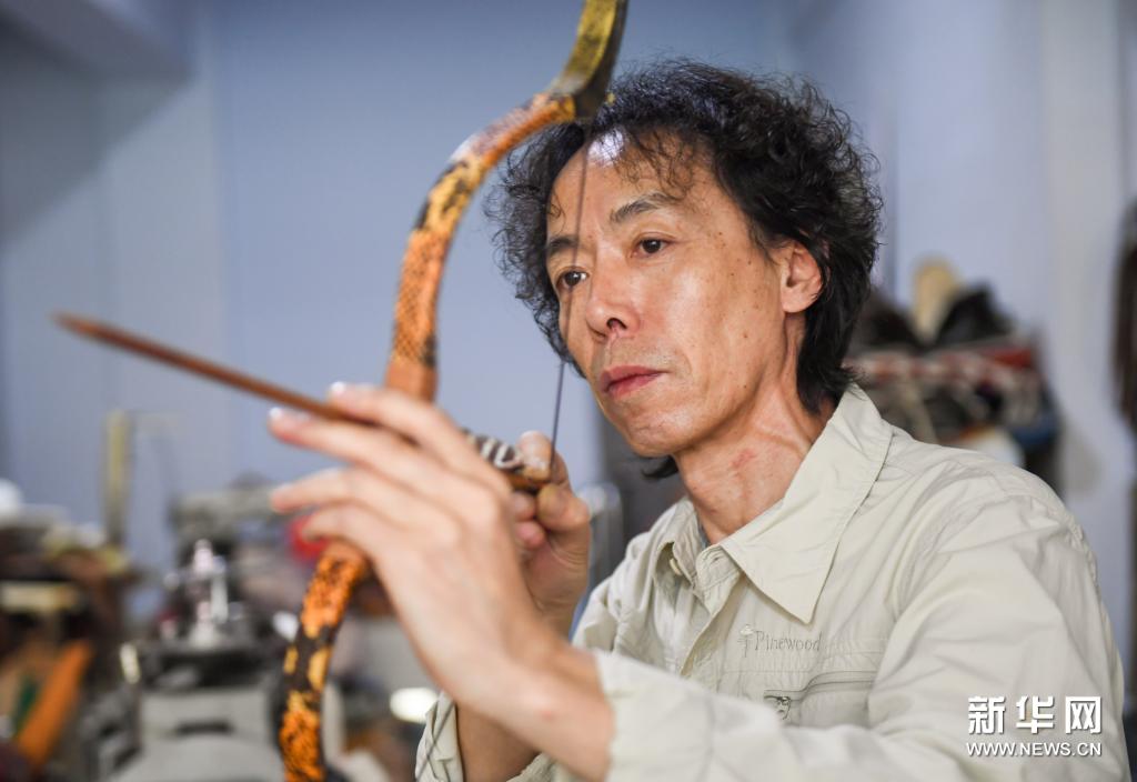 5月26日,锡林虎在工作室内制作弓箭造型的手工艺品。新华社记者 彭源 摄