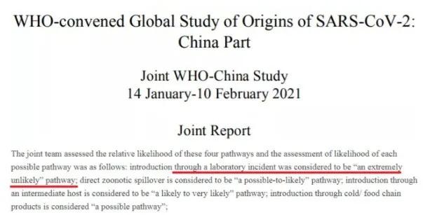 众所周知,今年3月30日发布的中国—世界卫生组织新冠病毒溯源研究联合专家组研究报告已经清楚地写明:新冠病毒“极不可能”通过实验室引入人类。