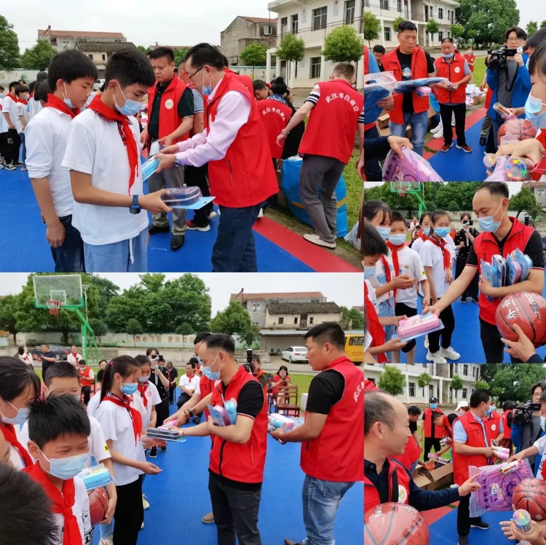 5月28日,武汉孝昌商会爱心企业家走进卫店镇南新小学、季店乡厉店中学开展爱心捐赠活动。