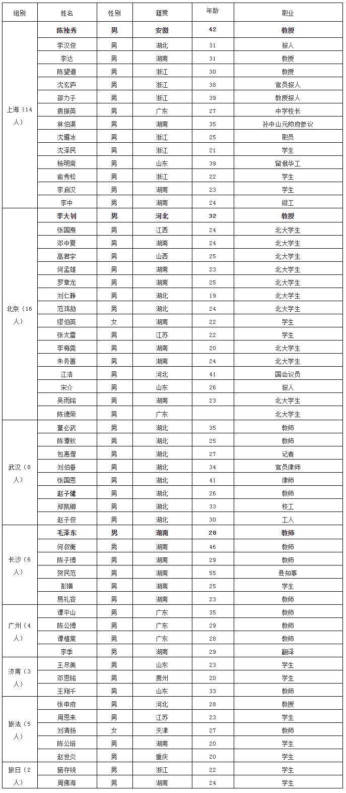 从职业看,大部分也是当时的“高薪”,像陈独秀、李大钊、张申府都是教授,李汉俊、林伯渠、江浩都是政府官员,这其中还有律师、记者、编辑、报人等等。
