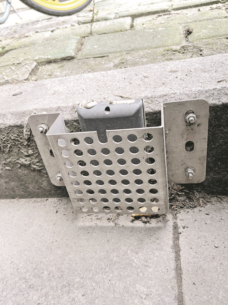 2日上午,记者在江汉区单洞三路与解放大道的交叉口看到,马路边大理石沿子上钉着一个不锈钢罩子,走近一看,罩子是镂空的,里面藏着一个遥控器大小的“黑匣子”。