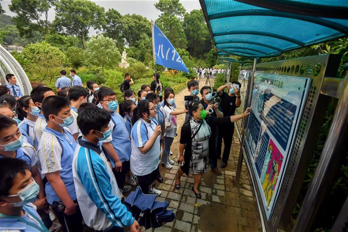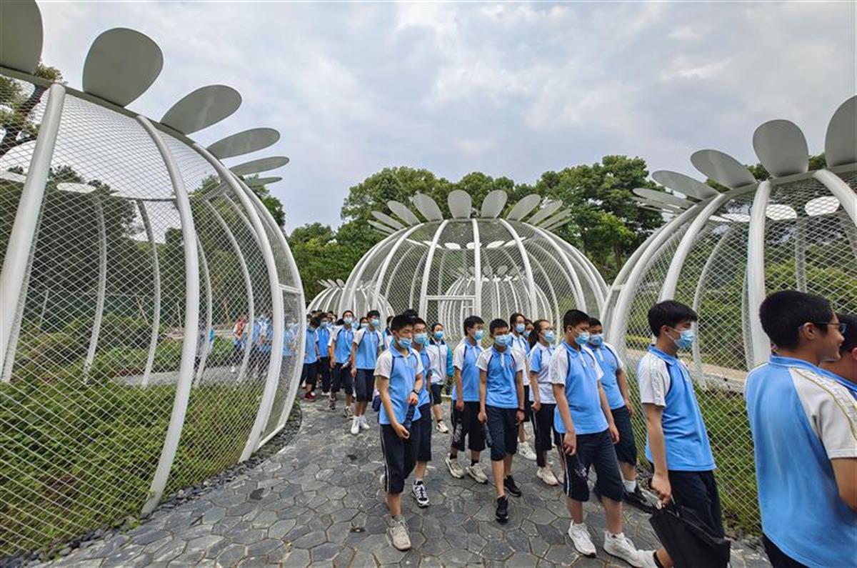园区小路边,是一排精心布置的展板,在讲解员的引导下,同学们饶有兴趣地观看展板上的彩图和文字,频频发问。