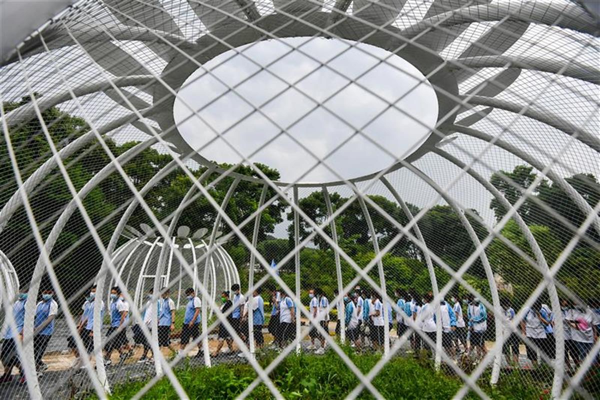 在植物园本草园,民警带领着同学们来到一个特殊的园区,这里的植物生长茂盛,却被铁笼子罩了起来。