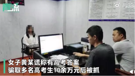 3、高考诈骗受害者3年后诈骗高考生 近日,安徽全椒女子黄某以“出售高考试卷答案”为由,骗取多名高考生10余万元。经讯问,黄某曾于2018年高考前在网上买答案,被骗了几万元。今年年初,黄某因网络赌博欠下巨款,便决定用自己曾经被骗的手段来骗钱。黄某定价每科1.5万元,共有5个省的考生被骗。目前,黄某已被警方依法刑拘。(@青流视频)