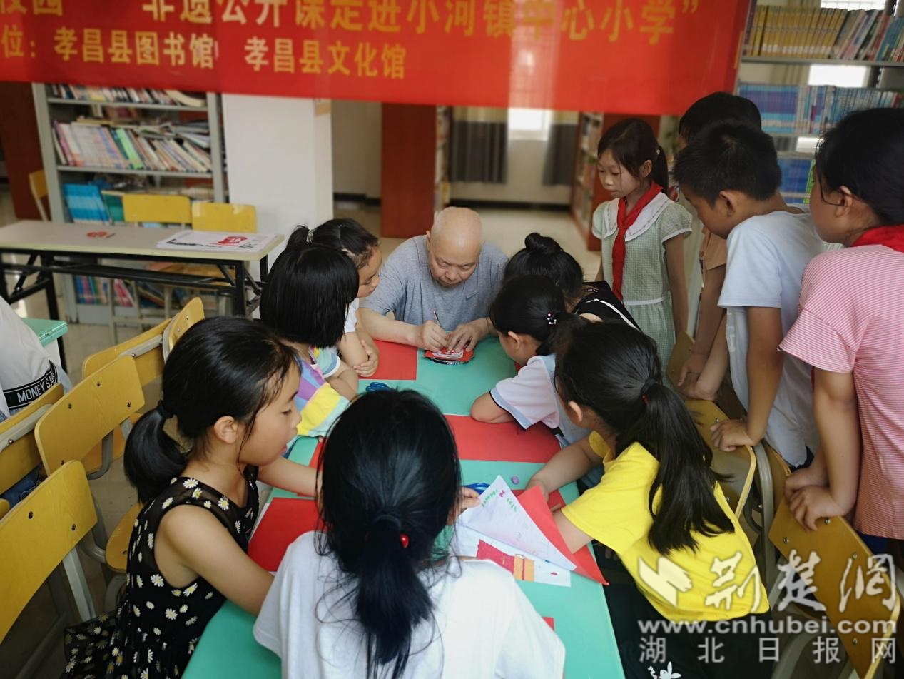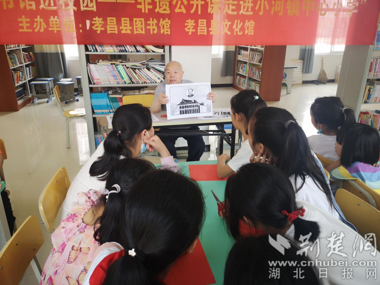 荆楚网(湖北日报 网)讯(通讯员黄一阳、朱静)6月3日,孝昌县小河镇中心小学开展了“红色剪纸忆党心 童心向党赞百年”剪纸活动,湖北省雕花剪纸非物质文化遗产传承人张玉义老人为同学们上了一堂别开生面的剪纸课。