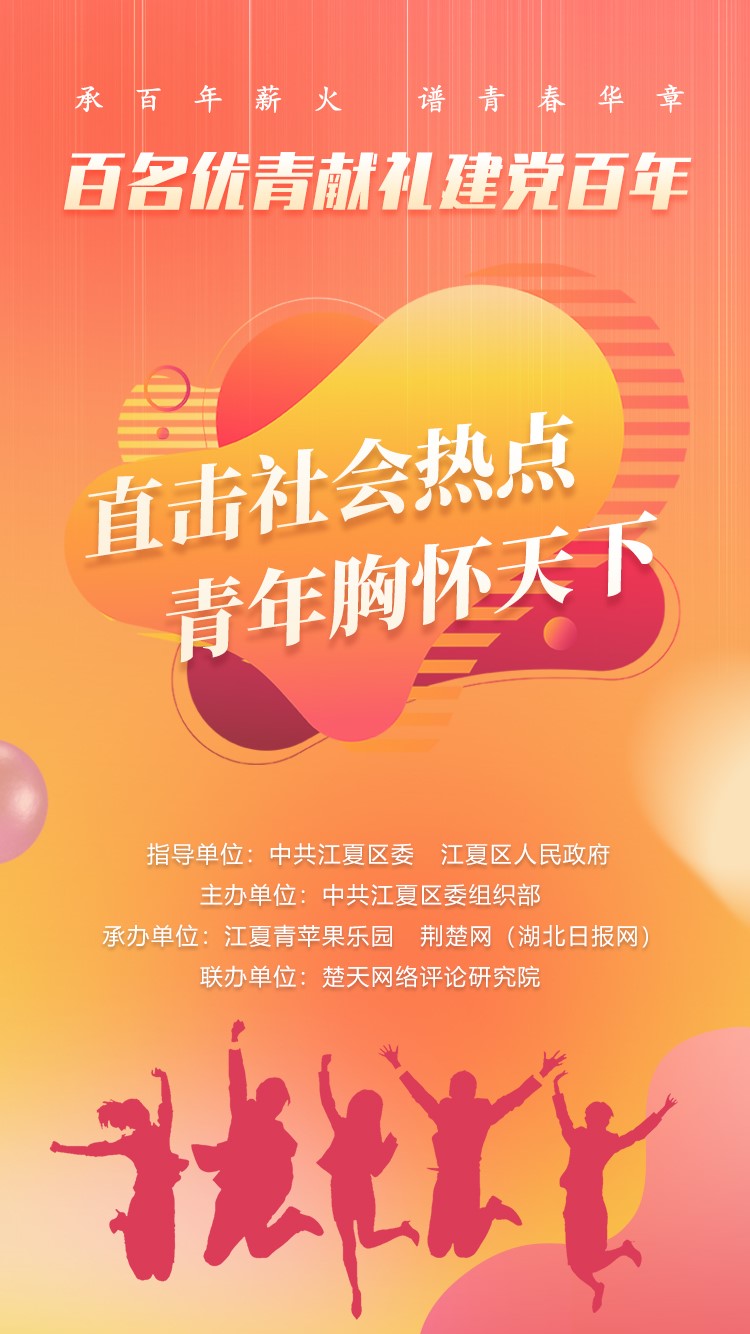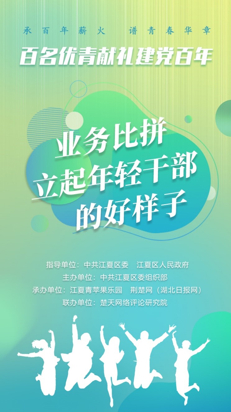 据介绍,“百名优青献礼建党百年”活动由中共江夏区委、江夏区人民政府指导,中共江夏区委组织部主办,江夏青苹果乐园、荆楚网(湖北日报网)承办,楚天网络评论研究院联办。活动于5月初启动,将进行作品征集、初选,专家评审会复评,演讲比赛,业务比拼,主题辩论等环节,加快发掘培养一批“信念坚定、为民服务、勤政务实、敢于担当、清正廉洁”的优秀干部,营造优秀年轻干部脱颖而出、健康成长的良好氛围,为“十四五”开好局起好步提供有力干部队伍保障。