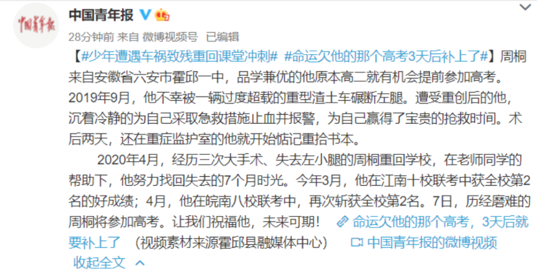 一场车祸改变了一切,本以为周桐的学业就此耽误了。但就在2天后,2019年9月24日,周桐的姑姑找到他的班主任,说在重症监护室的周桐想看书了,托自己来取课本。